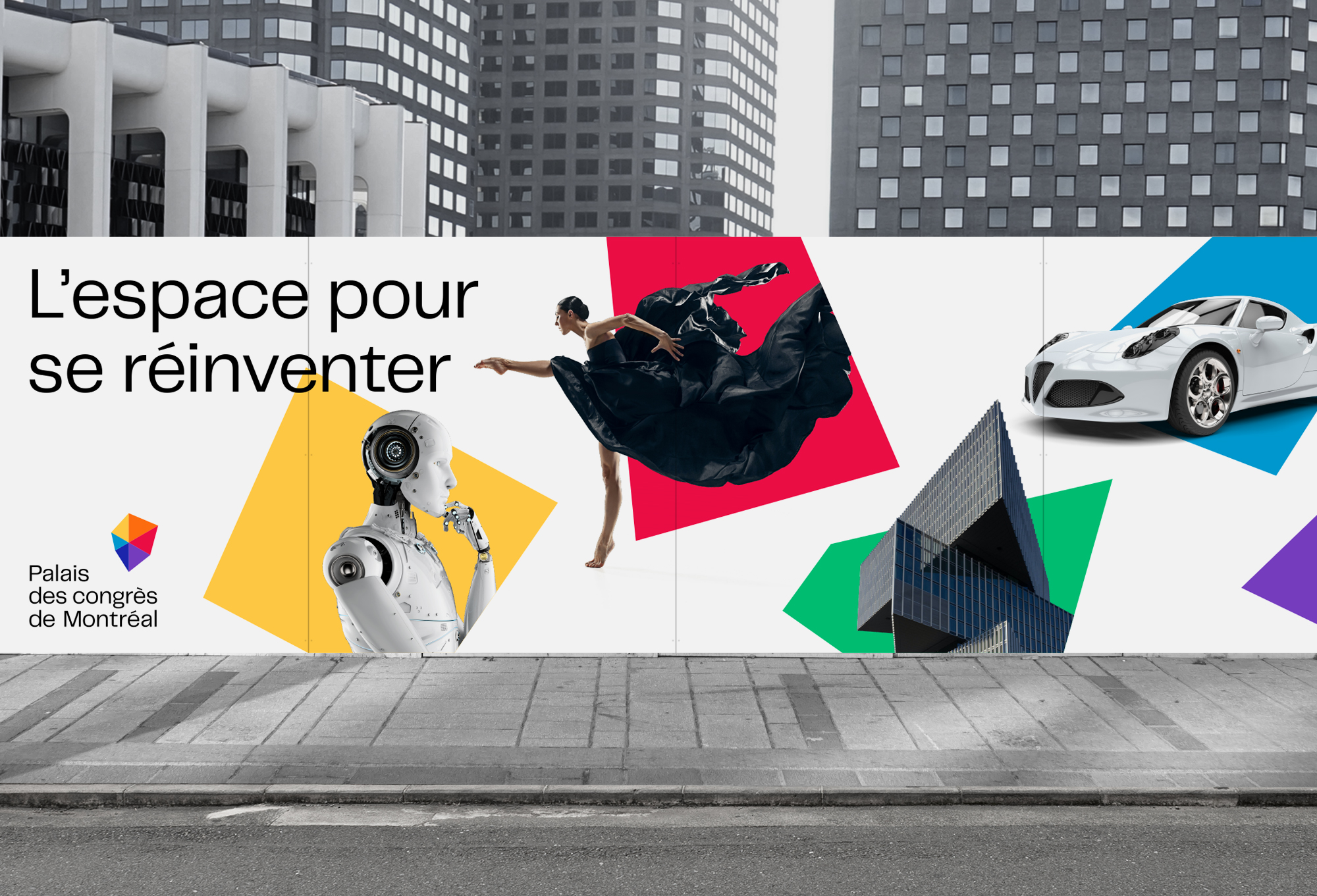 Identity and brand platform for the Palais des Congrès de Montréal. The new identity revolves around a central idea: vector space. Briefly defined as an entity with a structure that allows for multiple combinations, this concept recalls the Palais’ new vision, and also its gathering spaces where ideas converge. The six of the new logo and brand platform are inspired by the iconic, internationally renowned tinted glass wall of the building’s west façade.